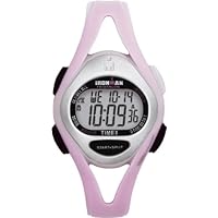 Timex gives its signature Ironman Triathlon multi-function, performance sport watch a sleek new look that's a great fit for both men and women. Featuring a full complement of athletic timing features and a striking profile, the Timex Triathlon Sleek T5D601 has a metallic silver resin case that's complemented by a uniquely styled, slim profile pink resin strap. It features three alarms that can be set for daily/weekday/weekend/weekly alarms, two time zones, an all-day white reflector display for easy reading even in direct sunlight, and water resistance to 100 meters. Sport timing functions include: