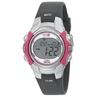 This mid-sized Timex Sports digital watch (model T5J151) features a durable pink and silver resin watch case with easy-to-access side buttons and quickly readable large digital display. Sport timing features include a 24-hour chronograph and 24-hour countdown timer. Other features include a daily alarm, dual time zone display, and water resistance to 50 meters (165 feet). It's completed by a comfortable gray polyurethane strap with a tapered profile.