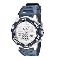 The cool and contemporary style of the Freestyle Men's Shark X 2.0 Analog-Digital Watch offers many features and a sporty design. The silver plastic case is topped with a unidirectional, silver-toned stainless steel bezel featuring silver-toned minute markers and Arabic numerals. A silver dial displays analog time with silver-toned indices marking each hour position and a date window at four o'clock. Silver-toned and white hour and minute hands and a black second hand are easy to see against the silver dial. The digital features include the month and day below twelve o'clock, day at nine o'clock, and digital time at six o'clock. Other functions include a heat timer, stopwatch, dual time, two alarms, pre-set timer, and a night vision backlight. A blue polyurethane band securely fastens with a buckle clasp. This timepiece offers analog quartz movement and is protected by a durable mineral crystal. The watch is water resistant to a depth of 330 feet (100 meters).
