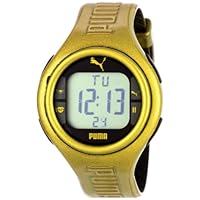 The PUMA Men's Pulse Metallic Gold Heart Rate Monitor Watch is a superb example of active style and functionality all wrapped into one. This watch features a metallic gold rubber case and bezel with a polyurethane band of the same color. Its digital display features the time, day and date and is protected by an acrylic crystal. Additional functions include an alarm, heart rate monitor, timer and water resistance up to 165 feet. There are convenient buttons to access this functionality right on the face of the watch. The watch is powered by quartz movement and secures with a standard buckle clasp.
