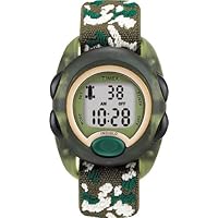 The Timex T71912 Youth digital watch is reliable, durable, and readable in the dark, thanks to the integrated Indiglo night-light, but it's also flat-out fun to wear. It features an easily readable digital display with large, recognizable icons for the chrono, alarm, and timer functions, and a comfortable elastic fabric strap (for better dirt and stain resistance) with camouflage pattern. This watch also offers water resistance to 30 meters (99 feet), 12/24-hour time, durable translucent olive resin case, large function buttons, and Timex's unique Kids Loss Protection Plan. It's recommended for children ages 6 and older.