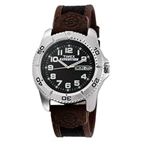 From the mountains to the sea, this Timex has no boundaries. Worn by extreme adventurists such as Conrad Anker, the Timex men's Expedition watch belongs to the great outdoors. The case is metal, and the black dial face is prominently embellished with contrasting Arabic numerals. Engraved Arabic numerals and alternating diamond-shaped indexes adorn the silver-tone bezel. The watch comes equipped with a reliable buckle clasp and an accompanying mahogany leather band. For convenience, the watch has a day-and-date calendar which rests at the three o'clock position. Additional components include the Indiglo night light and timer ring. Powered by analog-quartz movement, this sophisticated timepiece is a must-have for all fashion-savvy wilderness enthusiasts. This watch, which is also water resistant up to 330 feet.