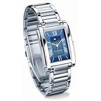 This mid-sized men's dress watch has sleek, classic styling with vintage details.The dark blue rectangular dial features silvertone sword hands and a signature Tommy flag logo.Vintage-style Roman numerals hug the perimeter, alternating with slender bar markers, and a small window at 3 o'clock displays the date.The dial is set in a polished stainless steel double-edged case and presents on a handsome steel H-link bracelet that fastens with a foldover pushbutton clasp. Like all Tommy Hilfiger watches, this one is water-resistant to 30 meters and can be worn while swimming or snorkeling.